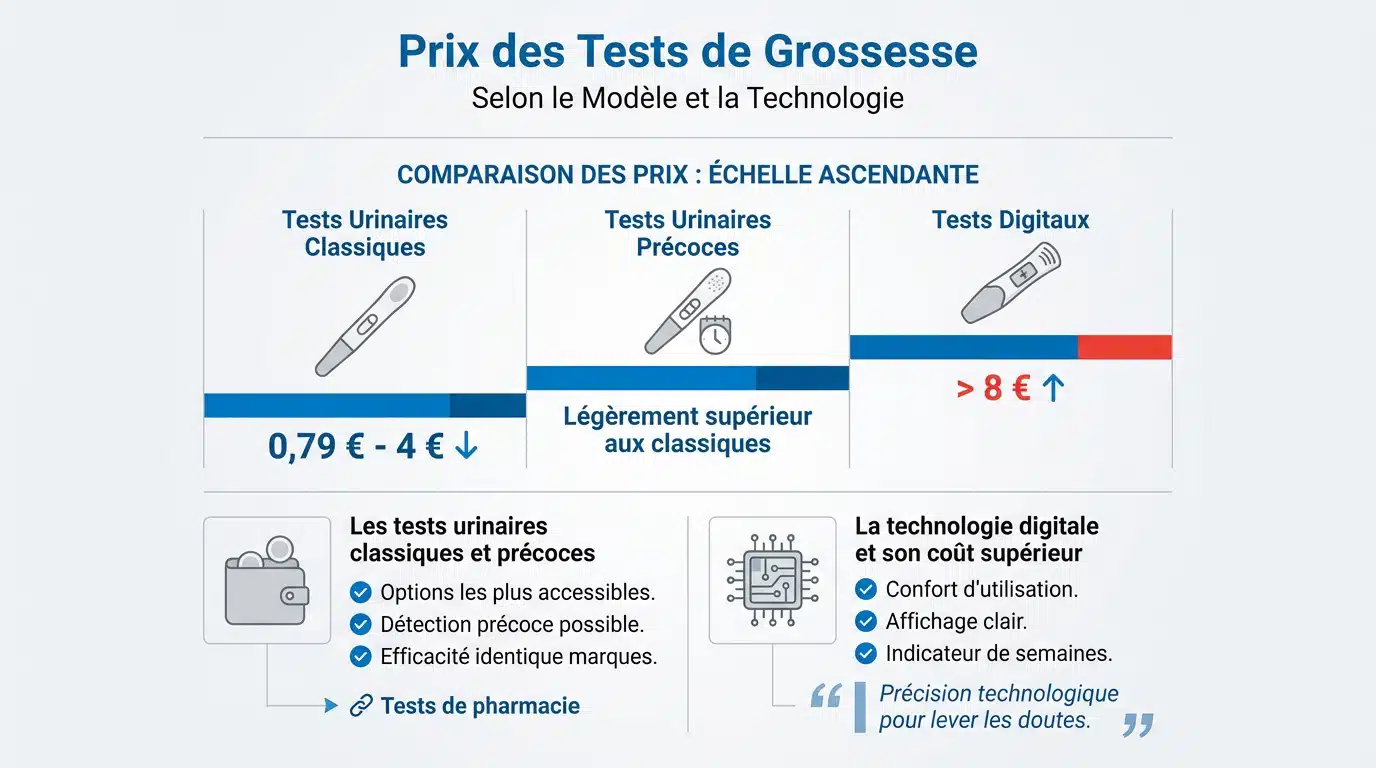 Pour les modèles plus technologiques, comme les tests digitaux Clearblue, le budget est plus élevé, variant généralement entre 8 € et 20 €. N’oubliez pas que les prix fluctuent d’une pharmacie à l’autre, il est donc malin de comparer un peu avant d’acheter.